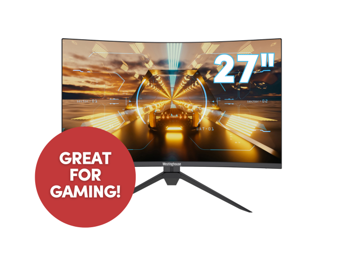 Westinghouse 27 inch Curved Gaming Monitor,Full High Definition / 1080P Resolution • VA Panel Specification: 72% sRGB Color Gamut / 16.7 m Colors, Response Time/ Refresh Rate: 1ms / 165hz, AMD Freesync, G-Sync Compatible Game Play: RTS/FPS, New Game Plus Mode • Eye Rest Technology / Flicker Free, Blue Light, Warm/Cool Mode and Anti-Glare screen • Edgeless / Rear Illumination (RED) • Metal Stand with Tilt -5 to +15 degree tilt • 100 x 100 VESA mount • Inputs: HDMI x 2, DP x 2 • Outputs: Headphone • Built-in Speakers • DP Cable IncludedDon’t See What You Are Looking For?